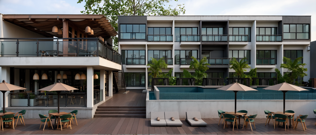 Caso de Éxito: Hotel Wyndham Garden San Blas Para este proyecto costero, la zona de piscina se concibió como un oasis. El diseño de paisaje se utilizó para generar privacidad y frescura, reforzando la experiencia de relajación frente al mar.
